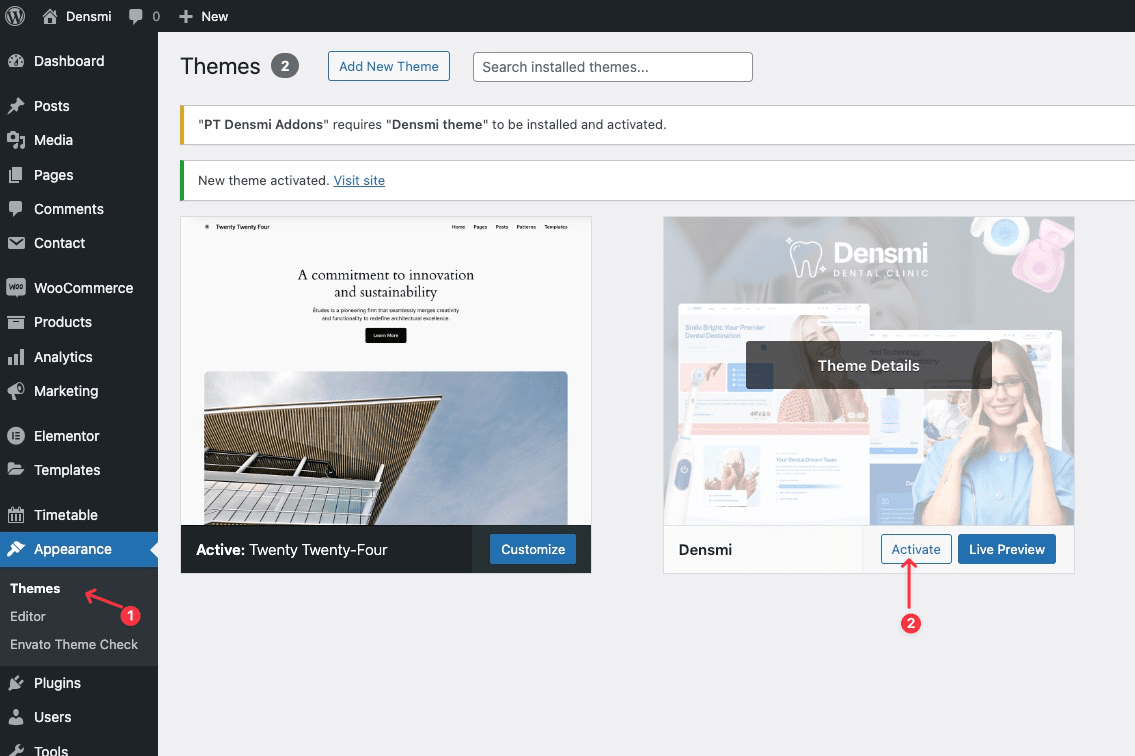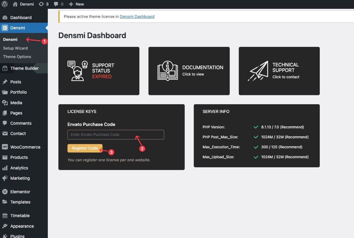 Download Theme files from ThemeForest by going to the Downloads tab and finding the Densmi Theme. Click on the Download button. The “All files & Documentation” archive contains everything and the Installable WordPress file is just the installable WordPress theme file.